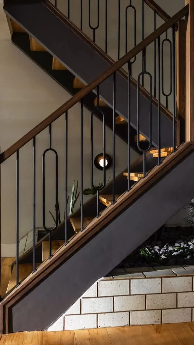 This 1955 home, located near downtown Auburn, required a complete overhaul and was stripped down to the studs. We enlisted an architect to redesign the layout, opening up the kitchen and dining room and enlarging the main bedroom and en suite. We then focused on space planning, creating a kitchen with a large island featuring a prep station, open shelves on either side of the range, and full-height cabinetry for a pantry and coffee bar. The lower cabinets along the half wall lead to the stairwell forming a bar and drinks station. Black metal shelves were incorporated into the wall separating the kitchen and living room, offering a glimpse into the front of the house.
